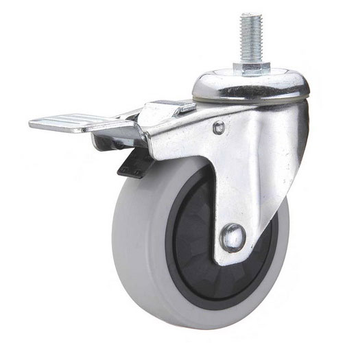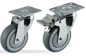 中型脚轮:采用双排珠波盘结构,支架可选不锈钢材质,也可选择镀锌、镀铬、镀古铜或镀镍支架。轮子可选择PP\PU\PVC\TPR或橡胶、尼龙、铸铁等;单轮直径尺寸:75、100、125mm;单轮载重:45—120KG(轮子大小和材质有关);